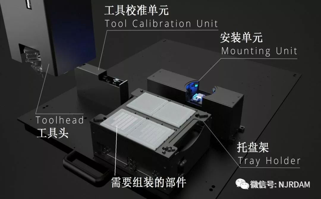 2) 加工头拾起放在托盘架上的元件并通过移动将其放在安装单元的平台上。