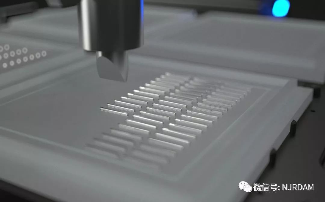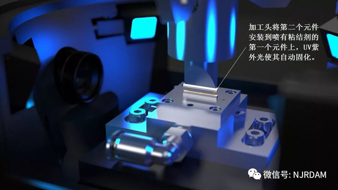 3) 随后射流分配器移动到第一个元件上方并喷射约200μm宽的粘结剂线条在元件上表面。然后加工头再次拾起第二个元件并移动到第一个元件上方,工具校准单元自动校准位置,随后加工头将第二个元件装配到第一个元件上面,过程中利用其内部的UV紫外光照射并使粘结剂固化,完成微装配过程。