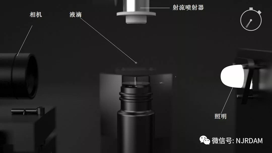 4)校准过程细节:自动校准单元通过相机与喷射分配器驱动照明同步,液滴的飞溅在飞行中被捕获,同时液滴的XY位置被测量,并参考校准体的相对校准,完成校准过程。